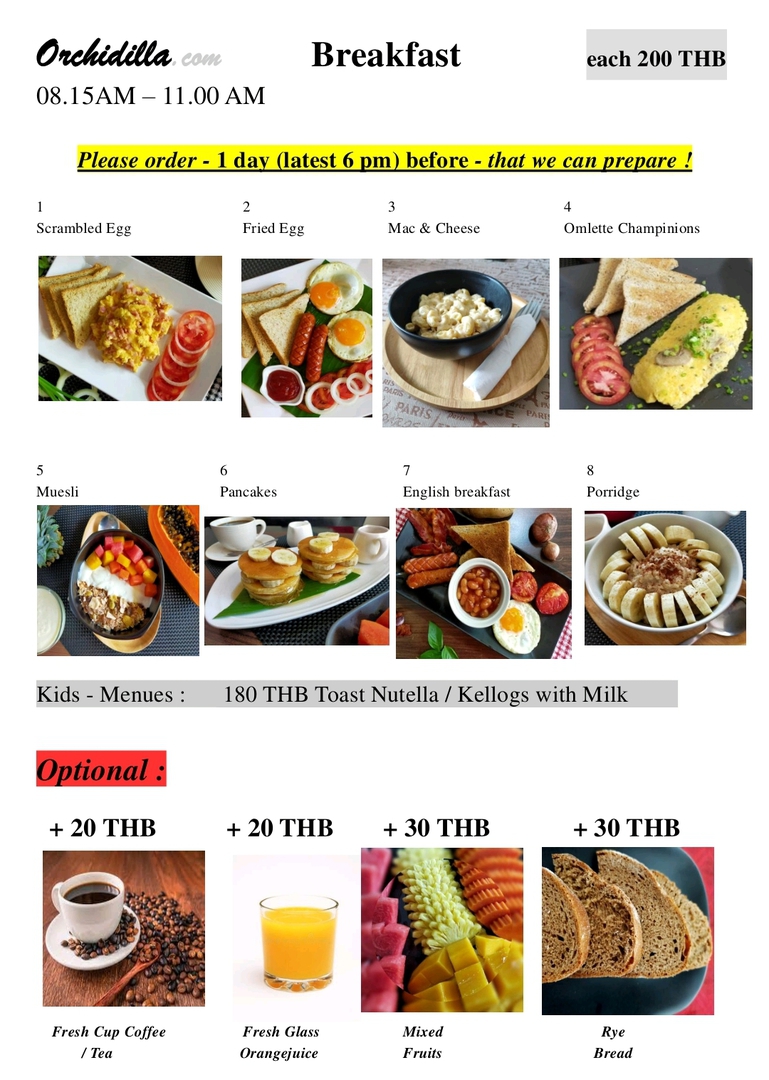 If our wish a Orchidilla breakfast we offer our service from 8.15 a.m to 11.00 a.m - not to a fix time (because many guest sleept ha ha and we not enjoy wake up. BF cold no good idea. Give us a
